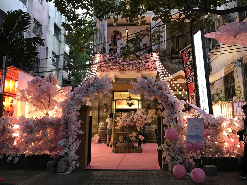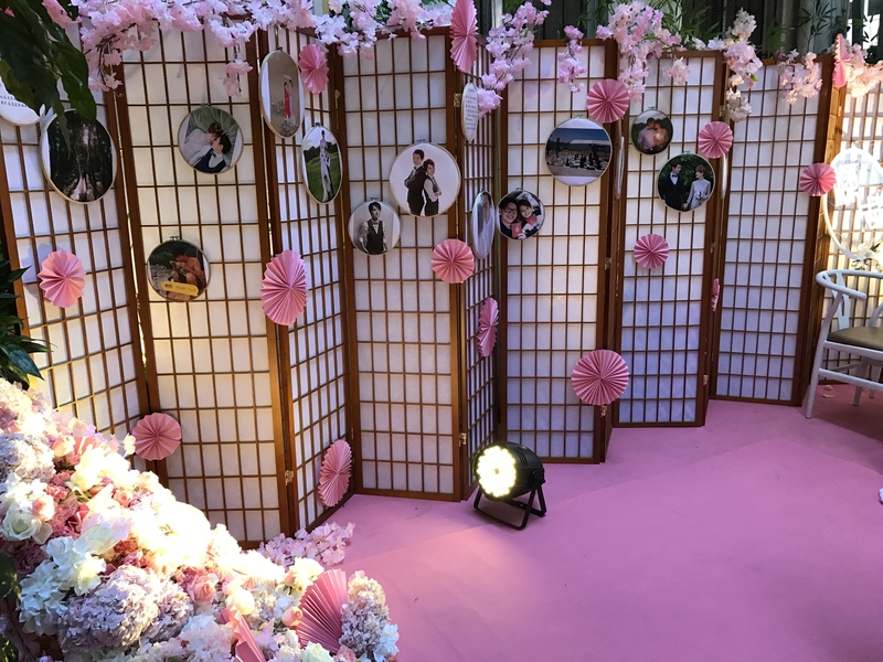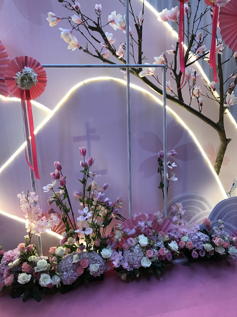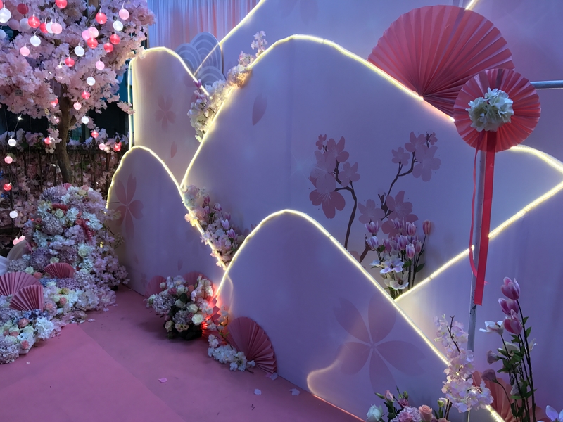 留影区:樱花树、许愿牌、多层背景KT、玫红丝带、鲜花、泡泡灯串.......