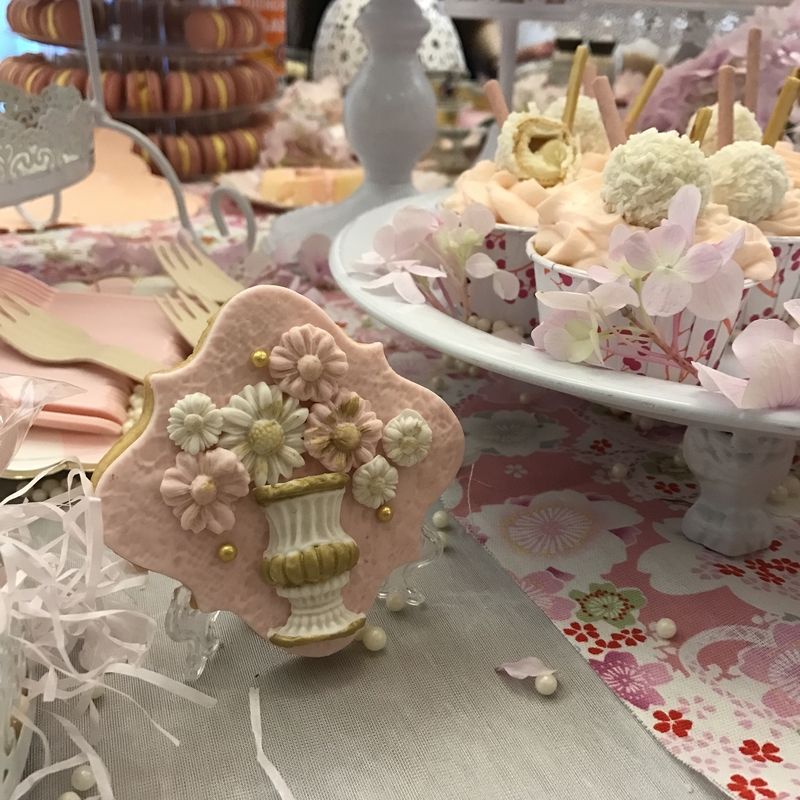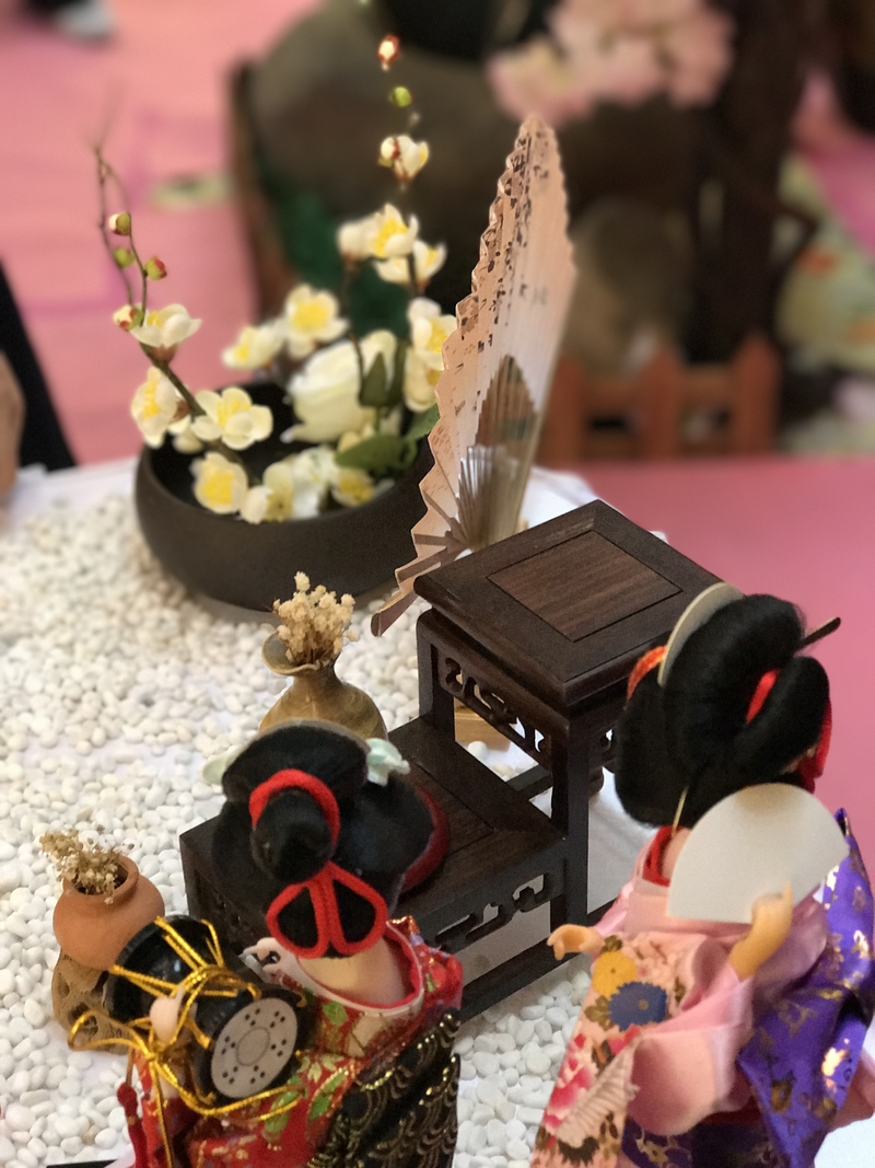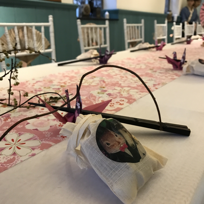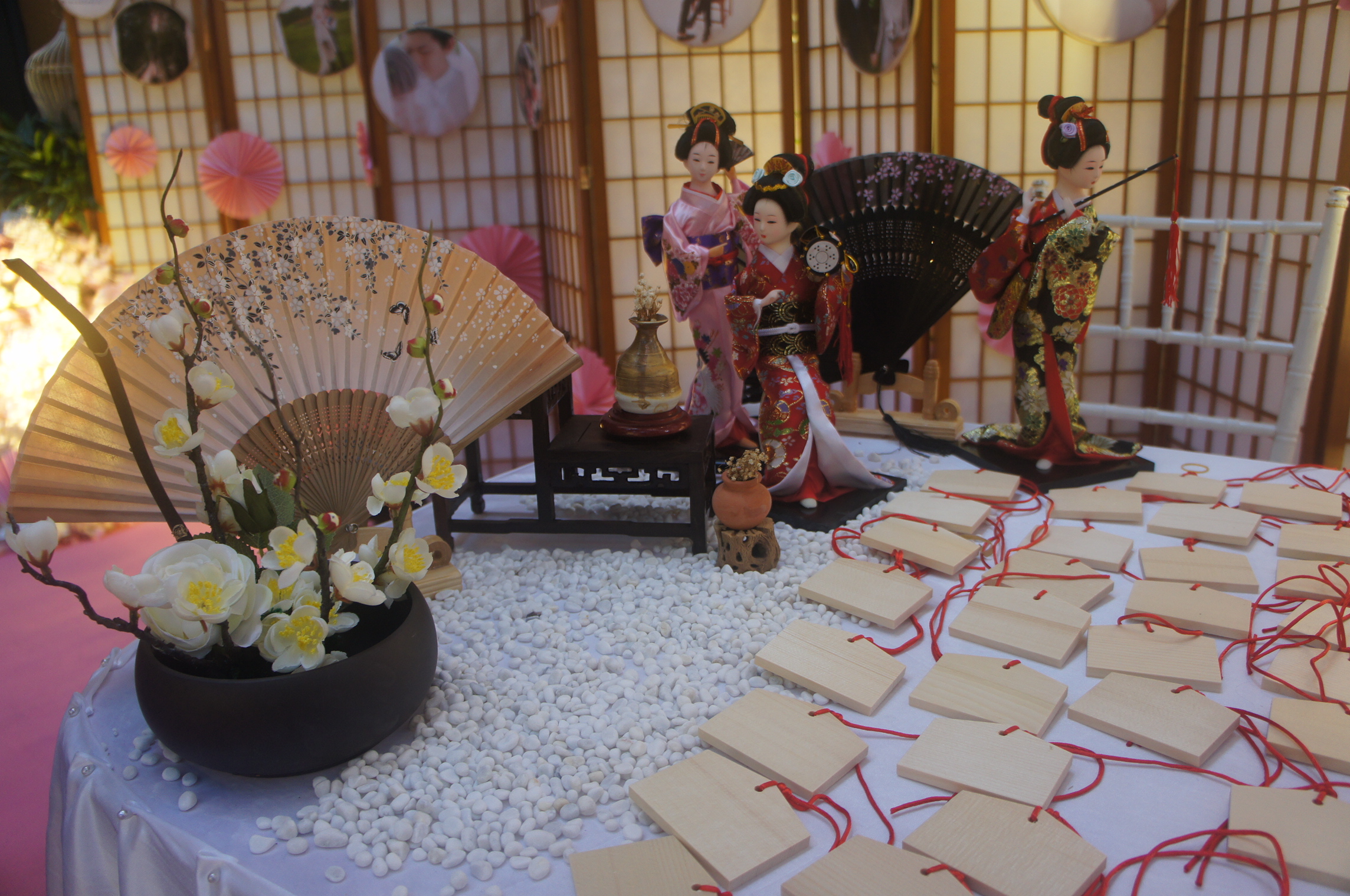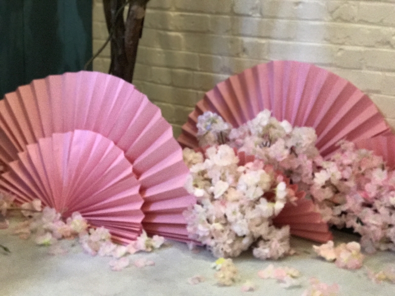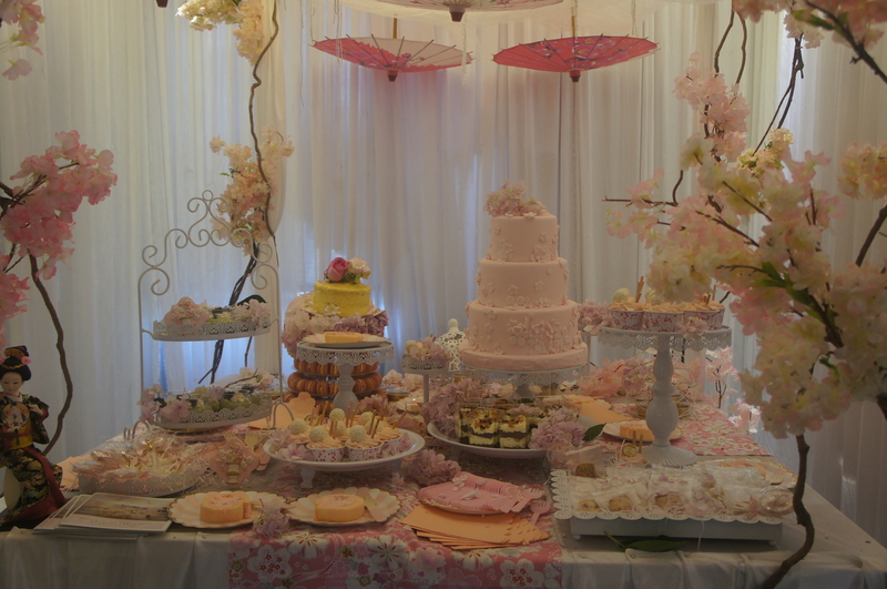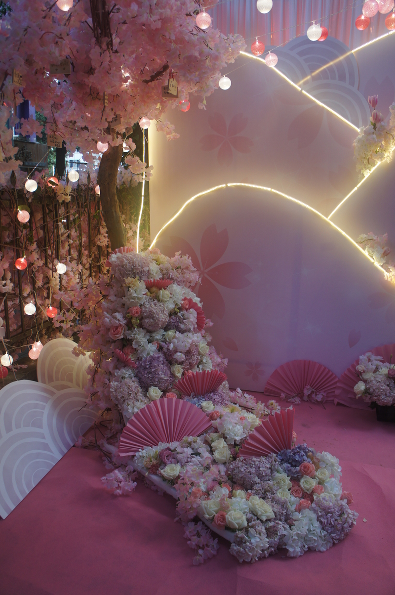 甜品区:日式印花布、甜品架、油纸伞、线帘、樱花