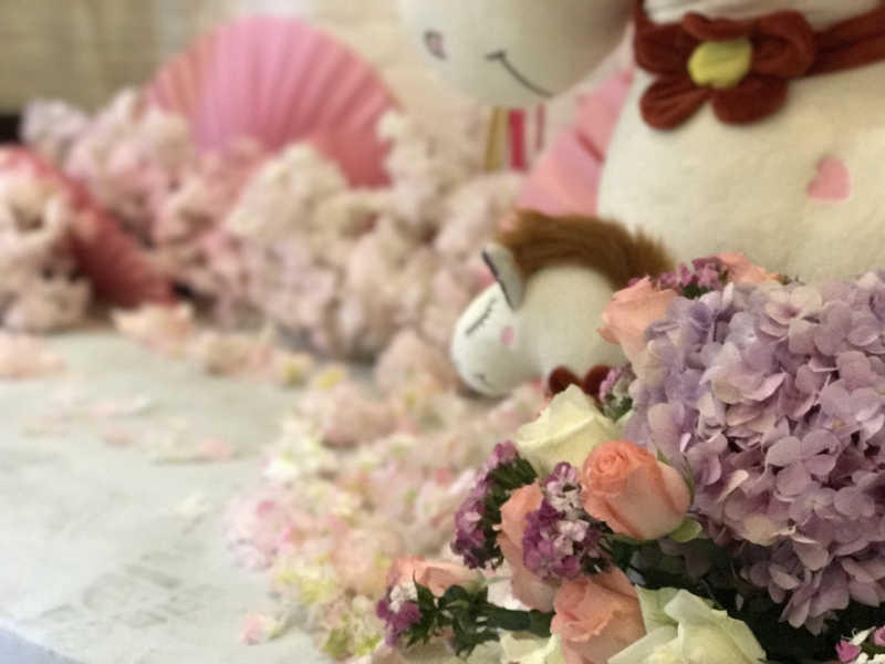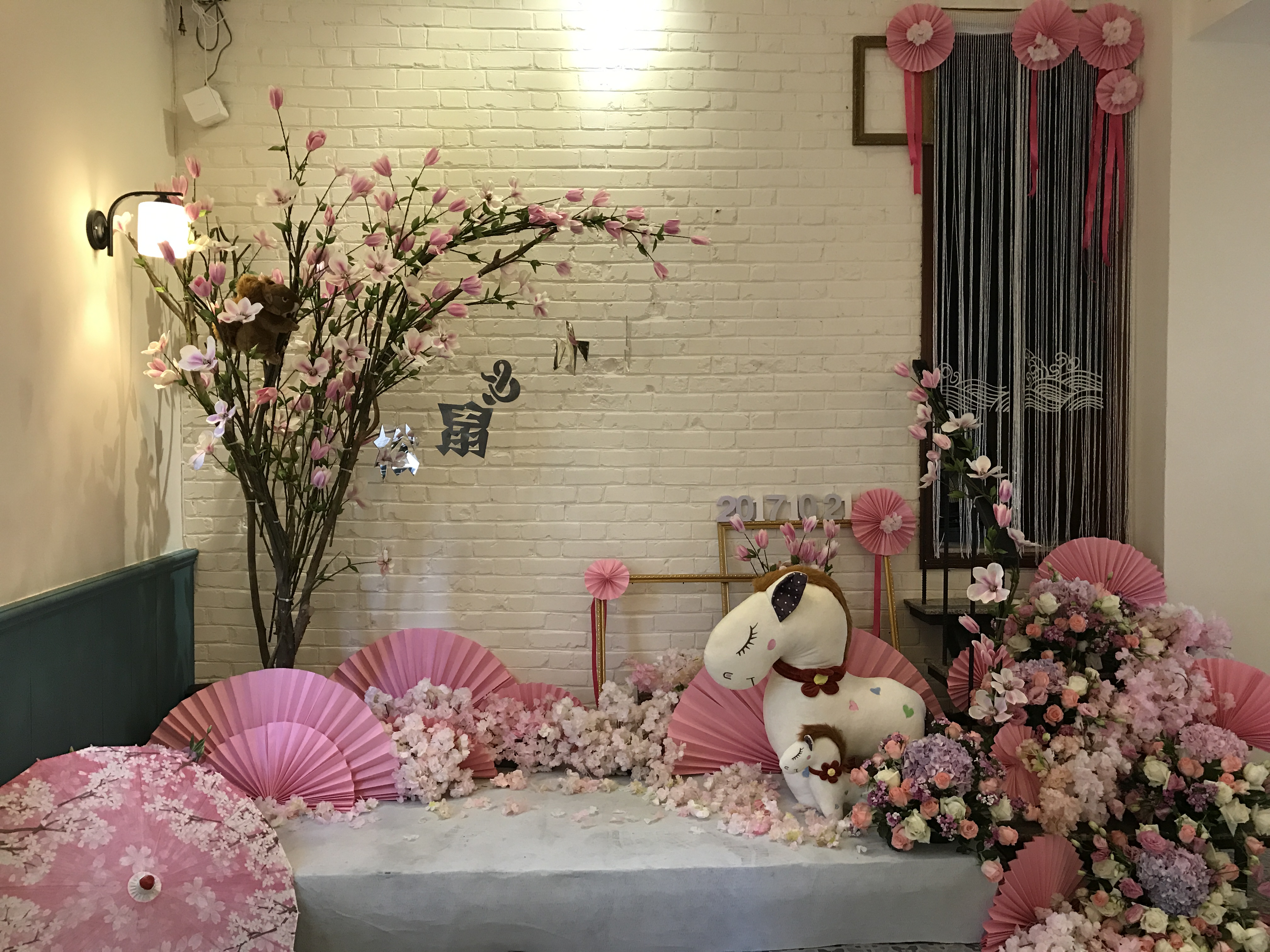派对区:粉白花瓣、扇子、椅背鲜花、木色相框、松鼠、马、线帘、镜面亚克力花瓶、白色数字、纸扇花、玫红丝带、油纸伞、假樱花、鲜花