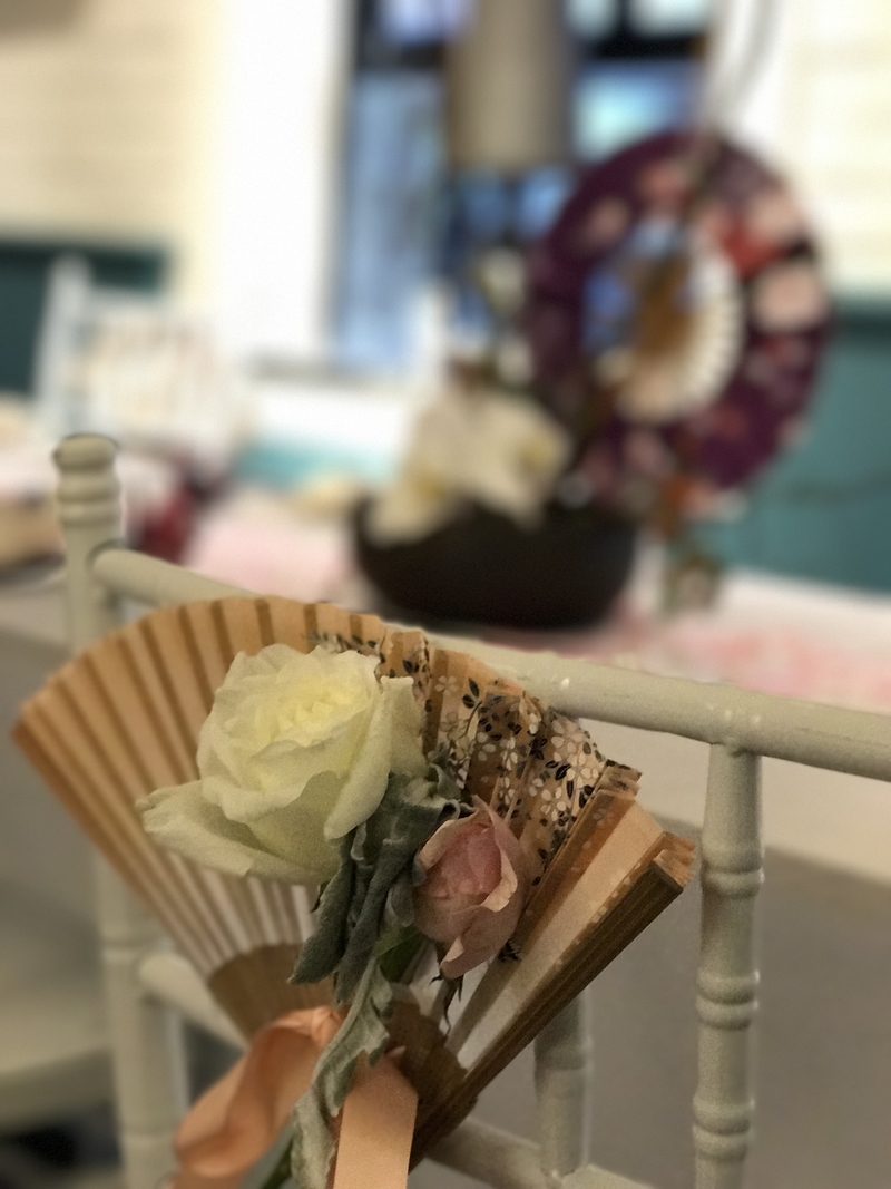 宴餐区:日式印花布、椅背花、桌花、白色竹节椅.......